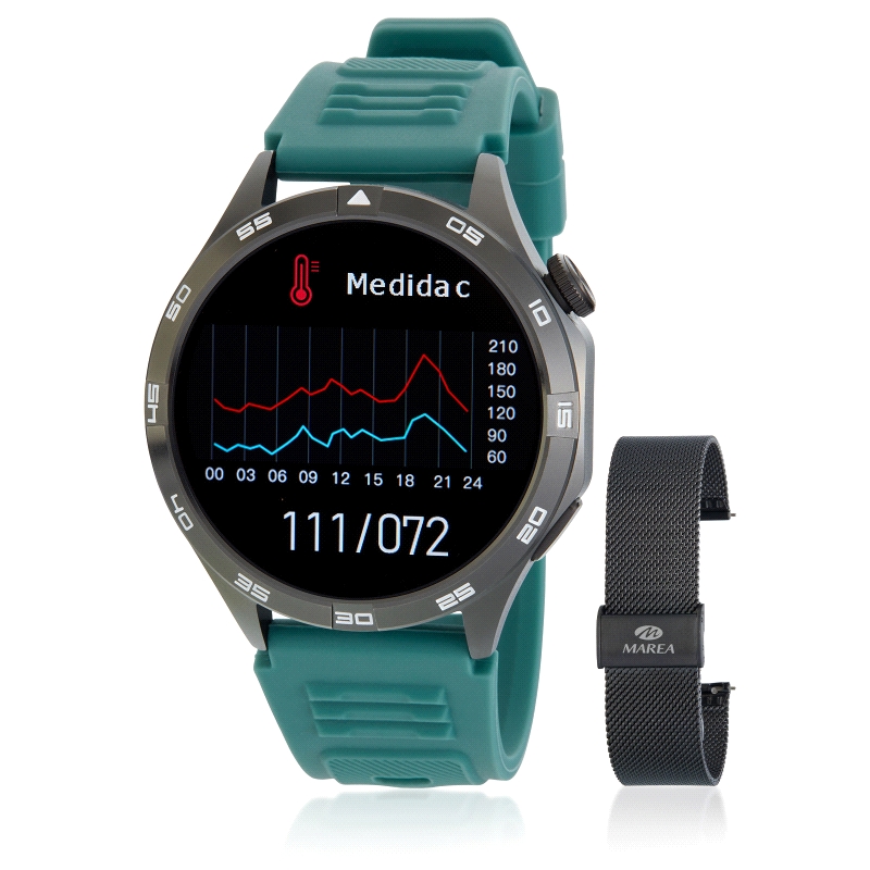 Material Brazalete: Acero color negro + correa intercambiable de silicona color turquesa.